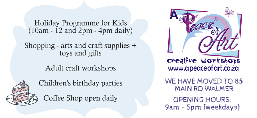 A great way to entertain the kids these holidays is to take advantage of the arts and crafts classes on offer at “Peace” of Art at the Peace@Heart Creative Village in Main Road Walmer.