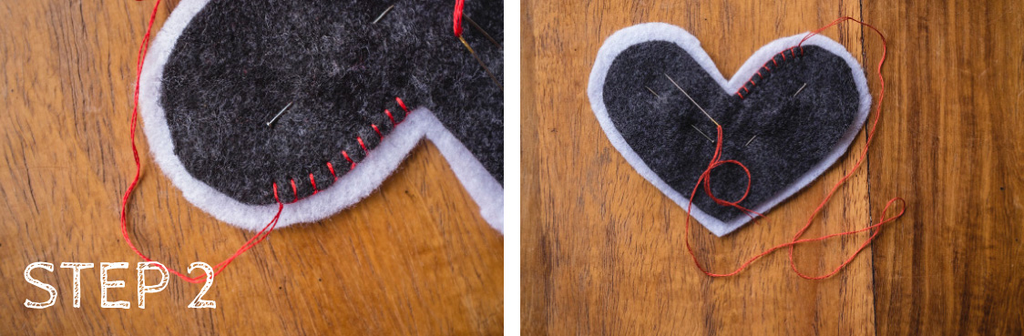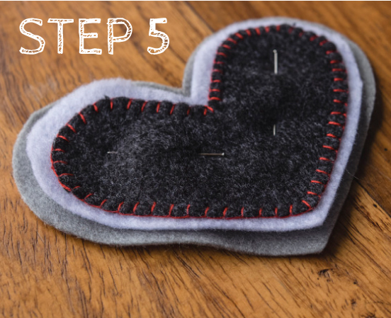 Now comes the fun part! Sew your little heart to your medium sized heart. It will save you some heart ache if you take the trouble to pin them together. You can either use a running stitch or a blanket stitch to do this, it is totally up to you. When doing this kind of stitching, I like to use 2 strands of embroidery thread. Because it is a little thicker, it gives a nice decorative finish.