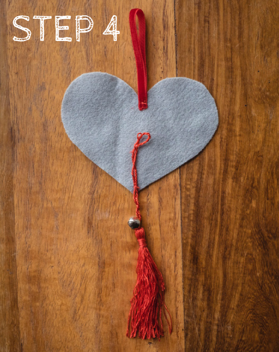 STEP 4: Once that is done, you need to prepare your finishing touches. I love bells at Christmas time, they always feel magical, so I have included some bells and a tassel onto my little heart. I did this by threading the loop of the tassel though the eye of a bell.